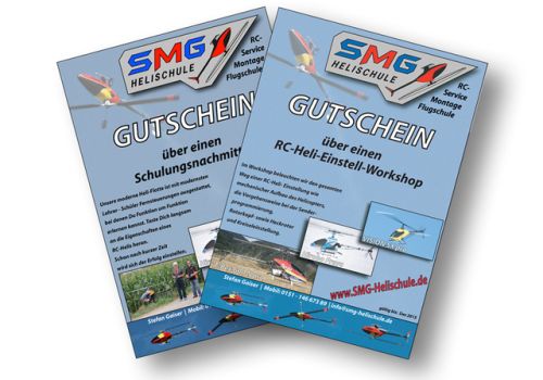 Egal ob Flugstunden mit dem Modellhubschrauber, RC-Heli-Einstellworkshop, Aufbauservice, Einsteigerkurs oder einfach nur einen Schnupperflug, ein Gutschein der SMG-Helischule ist immer etwas Besonderes.